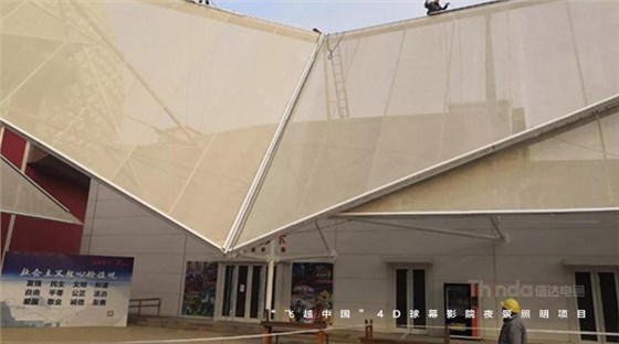 影院高32.8米,總占地總面積3600平方米。外觀的球形頂,代表著神秘浩瀚的宇宙和閃爍星空,神秘又等待著探索。外圍建筑狀似飛翼,采用的是鋼絲膜強(qiáng)化來建筑造型,展現(xiàn)建筑“飛躍”之勢(shì),正與“飛越中國”這一主題相契合!