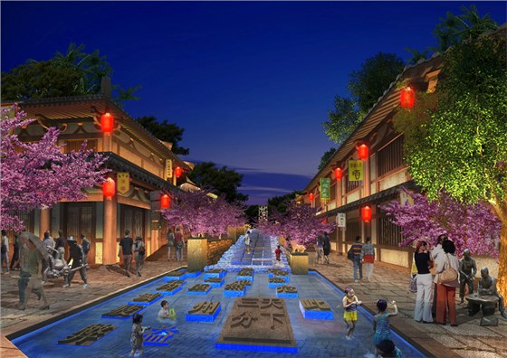 信達科技根據忠義街布局、載體特點,對整體夜景進行規劃,并對建筑、廣場、雕塑、水體、景觀、道路等載體進行具體設計,打造一場互動體驗式的三國主題度假休閑之旅。