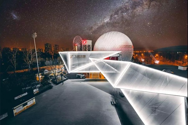 影院高32.8米,總占地總面積3600平方米。外觀的球形頂,代表著神秘浩瀚的宇宙和閃爍星空,神秘又等待著探索。外圍建筑狀似飛翼,采用的是鋼絲膜強化來建筑造型,展現(xiàn)建筑“飛躍”之勢,正與“飛越中國”這一主題相契合!