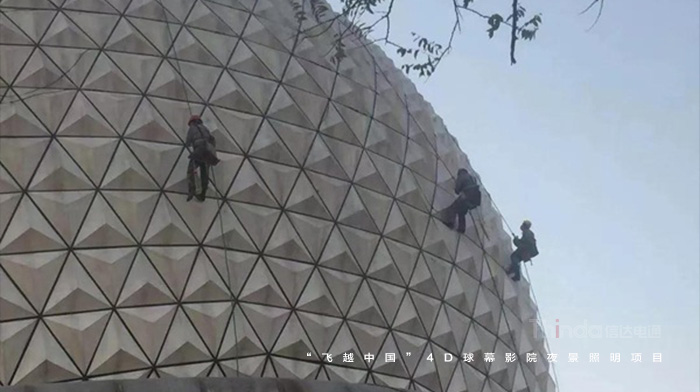 隨著球幕外立面光色切換,“我愛你中國”、“飛覽天下飛越中國”等主題字幕滾動播出。為實現(xiàn)預(yù)期的設(shè)計效果,信達團隊多次夜間試燈。