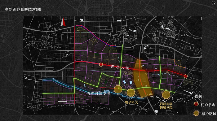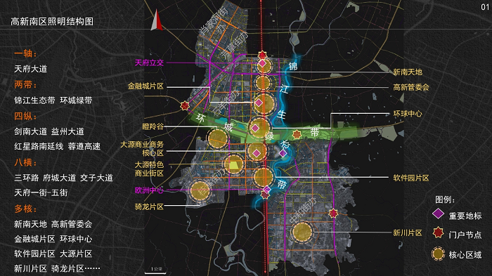高新南區(qū)以天府大道為中軸線(xiàn),形成一軸、兩帶、四縱、八橫、多核的照明結(jié)構(gòu)。
