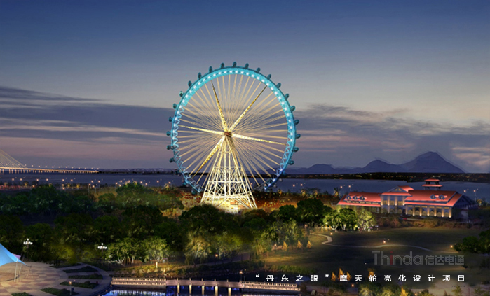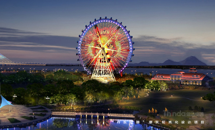 被譽(yù)為“丹東之眼”的摩天輪位于丹東新區(qū)的國(guó)門灣公園內(nèi),該公園占地17萬(wàn)平方米,是丹東比較知名的公園,而且丹東非常靠近中朝邊境線,所以此地區(qū)也被譽(yù)為:中朝邊境互補(bǔ)合作的橋頭堡和未來的區(qū)域綜合交通樞紐。在這重要的經(jīng)濟(jì)和科技發(fā)展地,丹東之眼屹立于此,為這絕美的景色填上了華麗的一筆,而信達(dá)電通的照明設(shè)計(jì)也體現(xiàn)在國(guó)門灣公園內(nèi)的標(biāo)志性建筑—國(guó)門灣摩天輪。