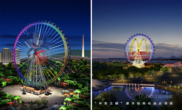 “丹東之眼”是中朝邊境一道亮麗的風(fēng)景線,信達(dá)在設(shè)計(jì)中采用絢麗的燈光和濃重的色彩。設(shè)計(jì)師通過燈光的動(dòng)態(tài)變化、光色的轉(zhuǎn)換,創(chuàng)造出一個(gè)歡樂、覽勝的燈光樂園。當(dāng)夜晚降臨,彩燈閃爍,摩天輪一圈圈地劃過點(diǎn)亮丹東最美天際線,顯現(xiàn)出其非凡的魅力!