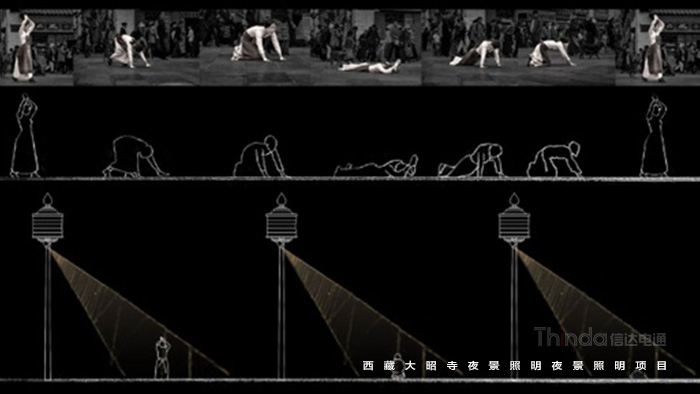 3)重大節日模式下所有照明燈具全開,重要節點投影經文開啟,使大昭寺成為一個巨大的轉經筒與朝拜的人一起緩緩轉動。
