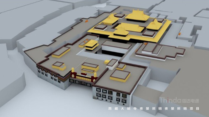大昭寺是四層樓的碉堡式建筑結構,各殿宇樓頂形狀高低不一,為全面營造金頂的夜間氛圍,信達科技采用投光燈投射金頂的設計方案。投光燈分布在圍繞大昭寺的十個點位上,根據被照物高度、角度設置燈具數量、高度、角度、方向,以實現金頂的整體亮度統一。