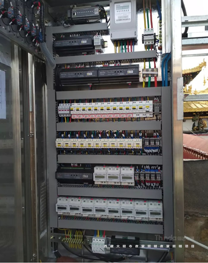 大昭寺的整體照明控制采用信達科技自主研發的鼎立慧聯智能控制系統。控制系統采用手動、時間經緯度、4G智能照明等控制方式,控制模式分為節能、平日、節日三種模式,總控制室設定在管委會樓頂景觀照明控制室。大昭寺四周所有投光燈具使用DALI調光控制系統,主控設備具有RS485擴展接口,同時系統可通過電腦圖形化界面對所有的燈光進行集中控制監視。