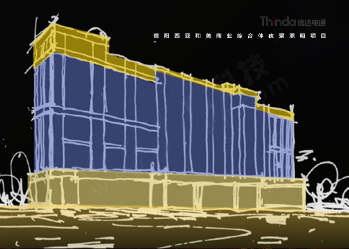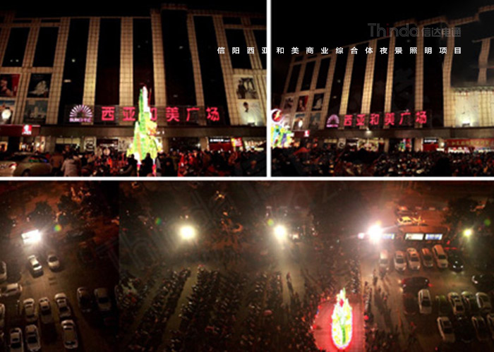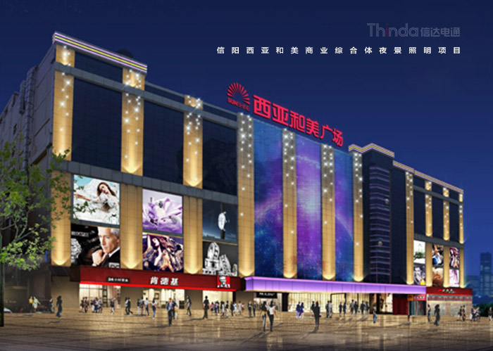 西亞和美商業(yè)廣場地處于河南省信陽市,位于東方紅大道、南臨北京南路、東臨統(tǒng)一街,周邊有鳳凰新世界、東方京城、軸線之廊,位置優(yōu)越,交通便利。這里信陽人民平時生活娛樂與購物餐飲的地方,也是IGA中國區(qū)優(yōu)秀零售商。目前商業(yè)廣場夜景照明已經(jīng)跟不上整體的商業(yè)需求,急需進行照明設計施工改造升級,為此信陽西亞和美業(yè)主聯(lián)系到信達電通,雙方根據(jù)本案開展照明設計施工合作。